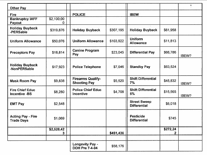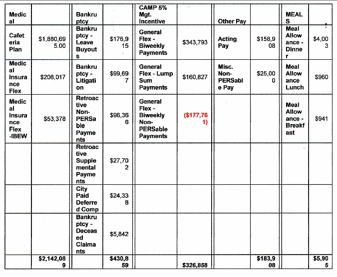 1 )The largest ($2,100,000) "Other Wage" payout was made to IAFF (fire union) as part of their claim against the City during bankruptcy. In addition to the $2,100,000 paid to IAFF the City also paid the IAFF lawyers $900,00 for a total of $3,000,000. In bankruptcy claims IBEW got $2,100,000 and VPOA $1,000,000 for a grand total of $6,100,000. Many employees who had complained that they had given back monies during bankruptcy were made whole/nearly whole.
